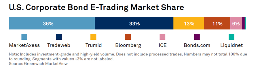 Coalition Greenwich’s analysis of the U.S. market includes a breakdown of margin trading market share among electronic trading platforms, showing that MarketAxess still dominates with 36% of total electronic trading volume, while Tradeweb has grown to 33%. Trumid, which reported its results early, is the third-largest platform with 13%, just ahead of Bloomberg in fourth place with 11%. ICE rounds out the top five with a 6% share.