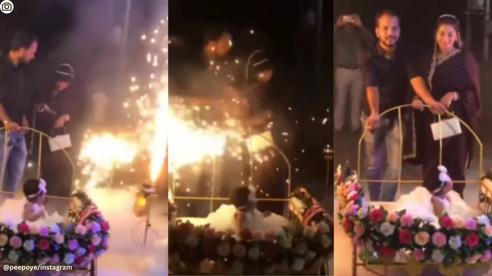 A video shared by Instagram user Akash Gupta depicts a shocking incident at a family gathering, supposedly celebrating a baby’s birthday. The video shows parents walking with their baby in a decorated stroller as fireworks go off. Suddenly, a firework explodes in dangerous proximity to the baby and parents.