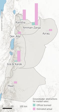 Most of the tanker water sold in Jordan is extracted illegally. The map below shows that the amount of water pumped from Jordan’s aquifers for delivery in tankers is 10 times the amount allowed under well licences.