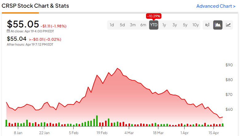 Analysts rate Crispr stock as a “moderate buy,” with 10 buys, 5 holds, and 2 sells over the past three months. CRSP’s average price target is $80.47, with a high estimate of $112 and a low estimate of $30. The average price target represents a 46.2% change from the previous price.