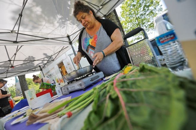 Fazio, a vendor with Coastal Foodshed at the New Bedford Farmers Market in Buttonwood Park, holds cooking demonstrations and tastings on the lawn behind Roller Library. Her dish on a recent day consisted of Swiss chard, garlic, olive oil, salt and pepper.