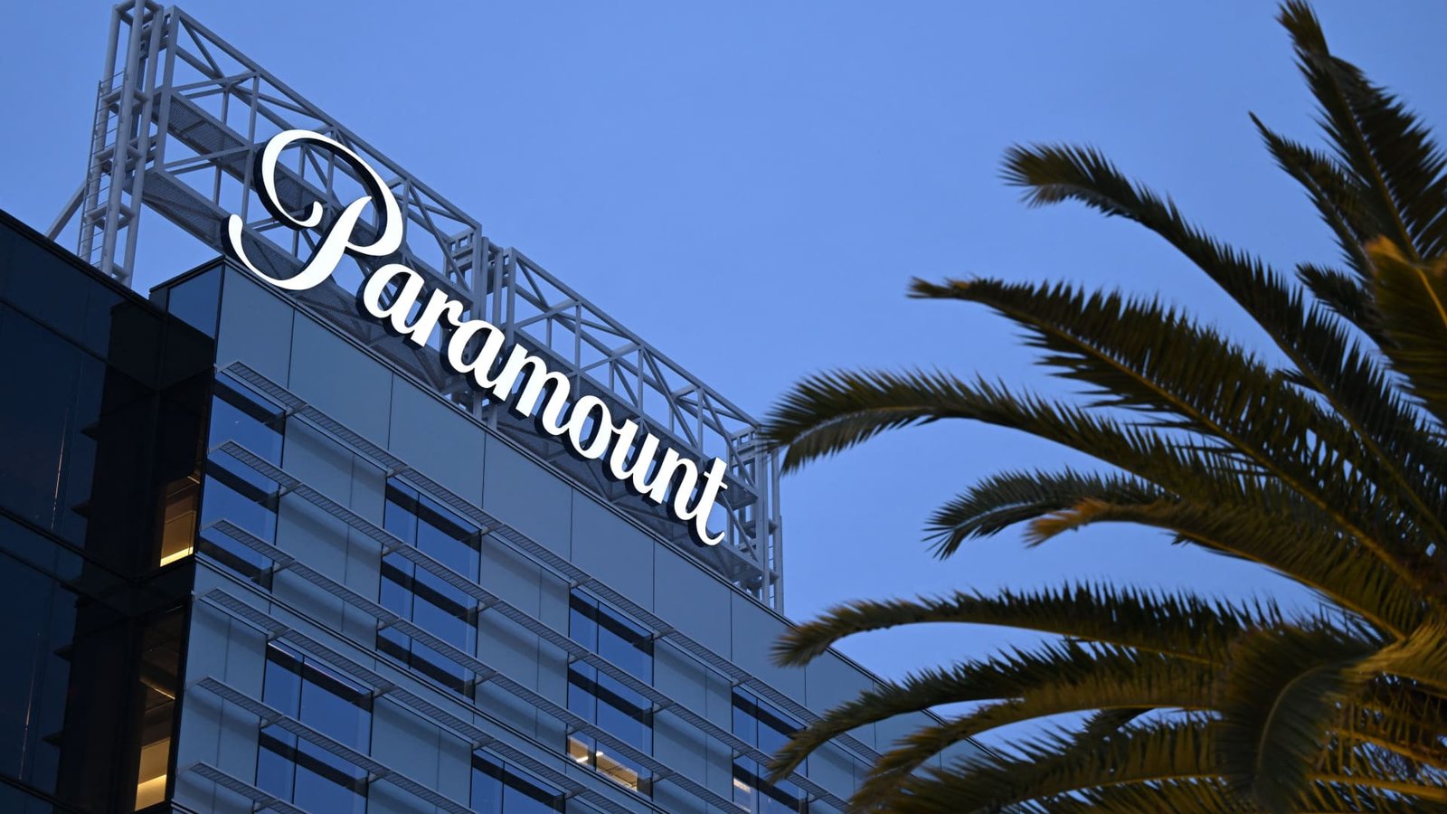 The Paramount logo is displayed at Columbia Square on Sunset Boulevard in Hollywood, California on March 9, 2023.