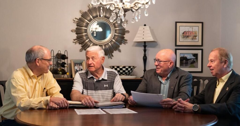 Frontier Investment Club’s Gordon Smith, Dan Wilson, Rich Scott, and Kevin Clark speak at the Wilson family’s dining room table on Tuesday, April 30, 2024. The eight-member club meets monthly to buy and sell stocks as a group. The club has been in operation for 67 years. (Joshua Bessex/Buffalo News)