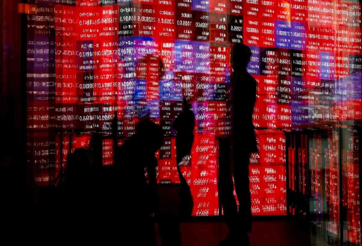 A visitor inside a building in Tokyo, Japan, sees Japan’s Nikkei stock average on the window glass as the average stock price soars past its all-time high set in December 1989, February 22, 2024. and an electronic screen displaying a stock price board.