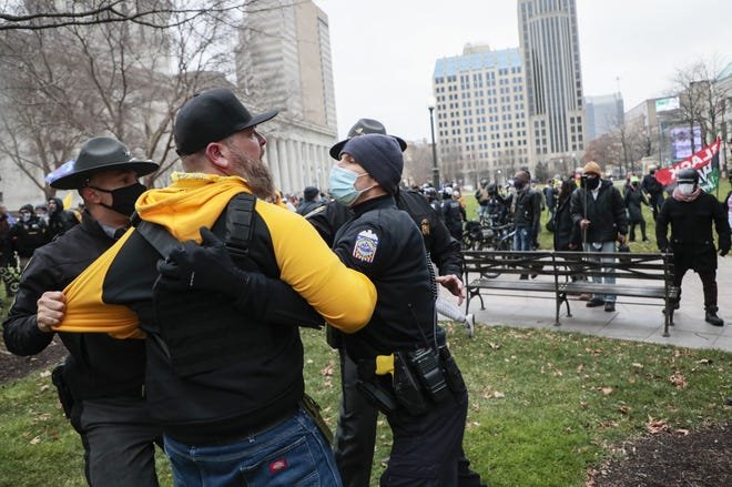 Law enforcement officers restrain a member of the Proud Boys as a fight breaks out during a “Stop the Steal” rally on Wednesday, Jan. 6, 2021 at the Ohio Statehouse in Columbus, Ohio. Hundreds of supporters of President Donald Trump, including members of the Proud Boys, a far-right, male-only political organization, came to the Statehouse to protest the congressional certification of Democratic President-Elect Joseph R. Biden Jr., who defeated the incumbent Republican President Trump during the November 2020 elections and whose victory was certified by the Electoral College in December 2020.