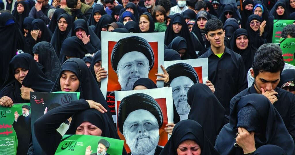 People in Tehran hold up pictures of Iranian President Ebrahim Raisi as they mourn his death in a helicopter crash Sunday, Monday, May 20, 2024. With the deaths of Raisi and Foreign Minister Hossein Amir Abdollahian, the country has lost two of its most influential figures at a time of regional and domestic turmoil. (Arash Khamoussi/The New York Times)