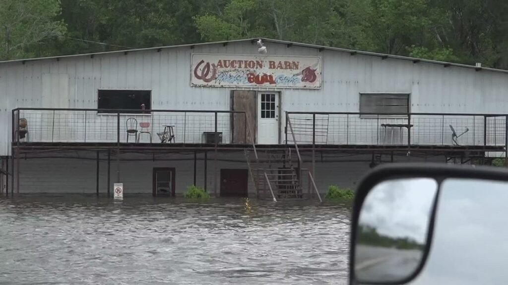 BEAUMONT, Texas — Kirbyville Auction Barn owner Jeff Muckleroy is preparing to reopen after six feet of rapid floodwaters filled the barn grounds and flooded the barn’s livestock from their homes.