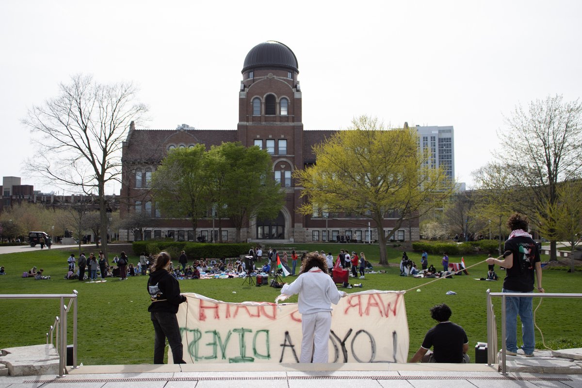 The Coalition for Solidarity and Justice hosted an emergency demonstration in the Eastern Quad on April 22 to demand that Loyola divest from companies that manufacture weapons used in Israel’s attack on Gaza.