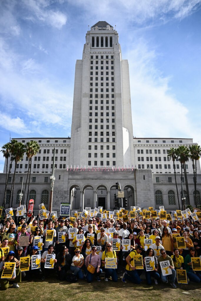 Journalists from the Los Angeles Times Guild rallied in front of City Hall on January 19 to protest the firings and posed for photos.