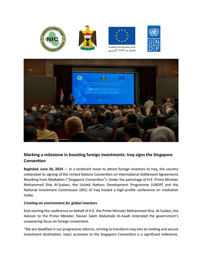 Baghdad, June 26, 2024 — In a landmark move to attract foreign investors to Iraq, the country celebrated the signing of the United Nations Convention on International Settlement Agreements as a Result of Mediation (Singapore Convention). Under the patronage of Prime Minister Mohammed Shia Al Sudani, the United Nations Development Programme (UNDP) and the Iraqi National Investment Commission (NIC) hosted a high-profile conference on mediation today.