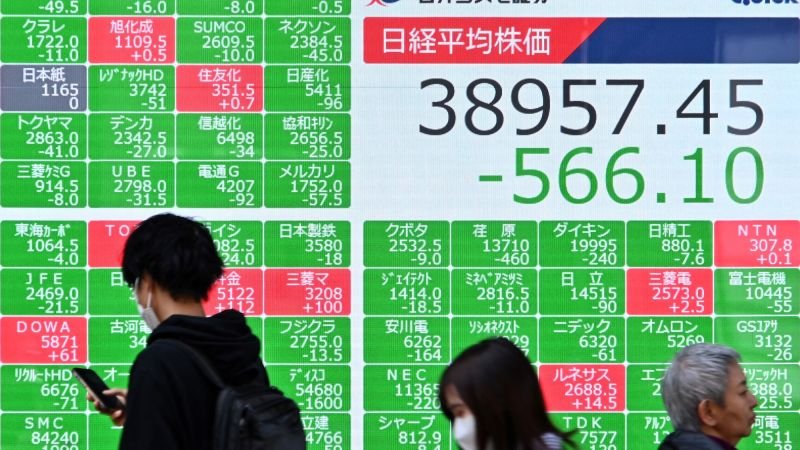 Electronic board showing Nikkei average stock price in Tokyo on Monday