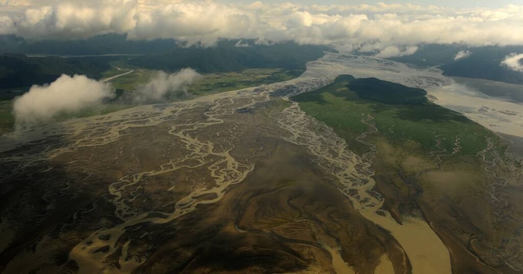 The waterway meanders through the tidal flats at the mouth of the Stikine River near Wrangell in southeastern Alaska, as seen from an Alaska Airlines jet on Friday, July 3, 2015. (Bob Hallinen/ADN)