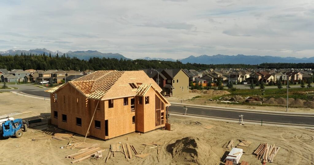 A duplex being built by Hallquist Homes on Gate Creek Drive in the West Gate neighborhood of west Anchorage on Saturday, July 9, 2016. (Bob Hallinen/ADN)