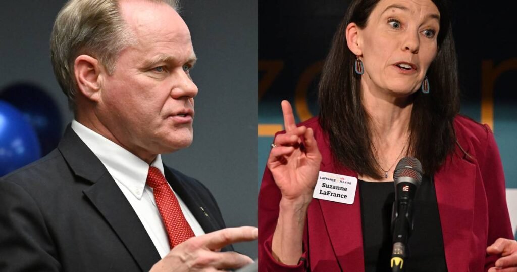 Incumbent Anchorage Mayor Dave Bronson (left) and former Council President Suzanne LaFrance are expected to face a runoff next month after the first round of election results are announced on April 2, 2024. was. (Bill Ross, Mark Lester/ADN)
