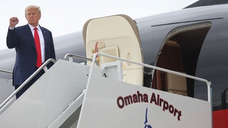 Former U.S. President Donald Trump prepares to board a jet at the airport after holding a campaign event in Near Council Bluffs, Iowa, on July 7, 2023 in Omaha, Nebraska.
