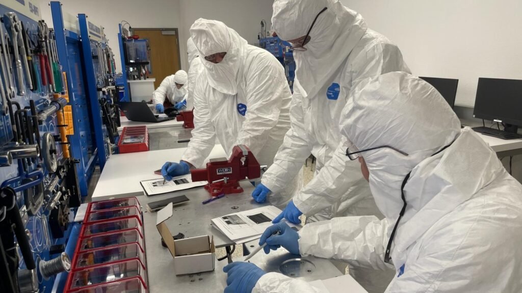 Students in Mesa Community College’s Semiconductor Technician Quick Start Training Course practice wearing bunny suits, a required work uniform at manufacturing plants.