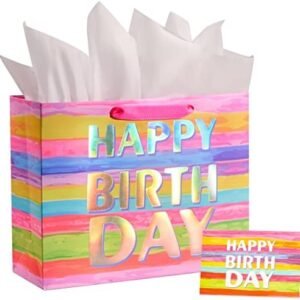 SUNCOLOR 13″ Large Gift Bag with Card and Tissue Paper (Colorful Happy Birthday)
