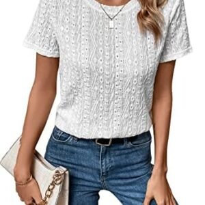 SweatyRocks Women’s Eyelet Embroidery Short Sleeve Tops Shirts Solid Crewneck Retro Plain Casual Holiday T-Shirts