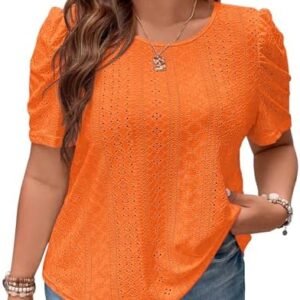 2024 Womens Plus Size Tops Eyelet Embroidery Puff Sleeve Tee Crew Neck Shirts Casual Soft Blouse Loose Fit Tees