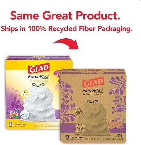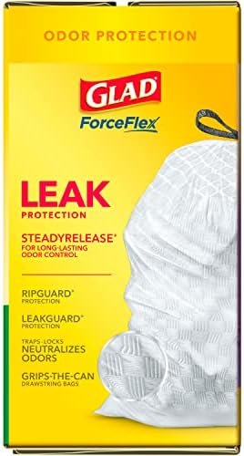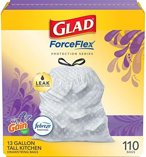 Fight nasty kitchen odors with the exclusive Glad trash bag combination of steady release Febreze freshness and irresistible Lavender scent only offered by Gain. Glad Tall Kitchen Drawstring Trash Bags are designed with ForceFlex technology to give extra flex as it expands around sharp edges and heavy loads, so you can pack it in while resisting tears, rips and punctures. These Glad trash bags leave behind a lasting Febreze freshness and a Gain Lavender scent. Let the stretchable strength of Glad ForceFlex handle all the messes our busy daily life can throw at it and then some. These trash bags are designed with RipGuard and LeakGuard technology to prevent seepage of liquids and keep trash contained. The durable Grips-The-Can Drawstring ensures a tight grip on the trash can to keep it in place. Take the trash to the curb with no fear of leaks and tears, and no frustration. Glad 13gal bags are comparable to Simplehuman E, F, G, H, J, K, M, N, P, or Q trash bags**.**Simplehuman is a trademark of Simplehuman, LLC. Glad is not sponsored by or affiliated with Simplehuman.