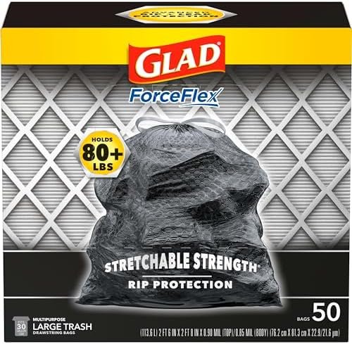 Keep your trash contained with the durability and quality of Glad. Glad Large Trash bags are made with ForceFlex technology and Stretchable Strength Rip Protection to give extra flex and expand around sharp edges without ripping, so you can pack in over 80 pounds of your heaviest trash. Designed with stretchable strength, these dual-layered trash bags feature RipGuard and LeakGuard technology to resist punctures, rips and tears, and leaks. Trust Glad to handle all your biggest trash messes inside and outside your home. The durable Grips-The-Can Drawstring ensures that the bag stays in place and provides a sturdy handle to make it easy to lift, carry and toss when its time to take out your trash bag. Trusted Glad strength helps you avoid messy trash disasters with a unique design that allows the bag to stretch at top while reinforced bands through middle contain bulky trash. Take on the trash and all your tough jobs with the confidence of Glad. Glad 30gal bags are comparable to Simplehuman K, Q, U, X, or Y trash bags**. **Simplehuman is a trademark of Simplehuman, LLC. Glad is not sponsored by or affiliated with Simplehuman.