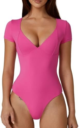 QINSEN Women’s V Neck Bodysuit Short Sleeve Body Suits Seamed Cup Going Out Tops Shirt