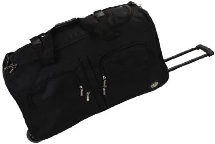 Travel in style with this great soft-sided rolling duffle bag. Bag features a heavy duty polyester construction. Inline skate wheels for superior mobility, internal retractable hide-away handle system, u-top opening provides easy access to roomy zipper secured main compartment. Two front zipper-secured compartments, adjustable ergonomic shoulder strap. Made of 600 denier heavy duty polyester. Measures 22″ L x 12″ W x 11″ H