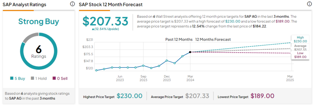 SAP stock is a “strong buy” according to analysts, with 5 buy and 1 hold assignments in the past three months. SAP’s average price target of $207.33 implies an upside potential of 12.5%.
