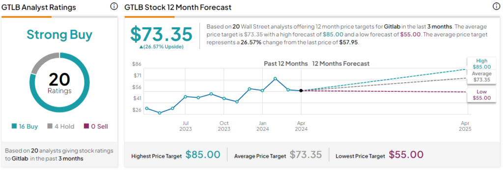 GTLB stock is a “strong buy” according to analysts, with 16 buys and 4 hold assignments over the past three months. GTLB’s average price target of $73.35 implies an upside potential of 26.6%.