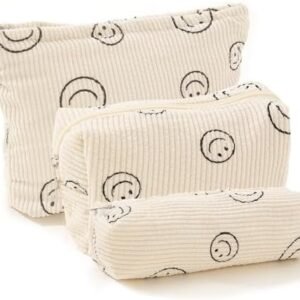 Makeup Bag For Women – Corduroy Cosmetic Bags Aesthetic Design Ladies Tote Bag,Women’s Pencil Case,Cute Smiley Face Makeup Organizer with Zipper (Beige)