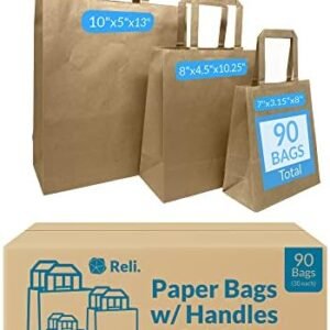 Reli. 90 Pack | Assorted Sizes Kraft Paper Bags w/Handles | 7×3.15×8-8×4.5×10.25-10x5x13 | 30 Bags Each Size | Paper Bags Combo Pack | Retail Bags/Shopping Bags, Gift Bags