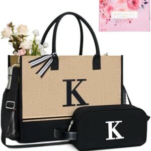 TOPDesign Personalized Initial Jute Tote Bag with 5 Pockets, Top Zipper Closure, Birthday Gift Set for Women, Mom, Teachers