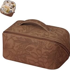 Travel Makeup Bag Large Capacity Cosmetic Bag with Divider Handed Waterproof PU Leather Portable Toiletry Bag for Women and Girl Valentines Day Gifts Brown Floral Makeup Bag