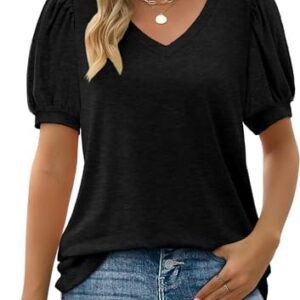 WIHOLL Womens Tops V Neck Summer Puff Sleeve Tshirts Fashion Casual