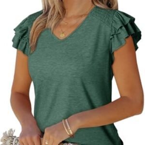 Dokotoo Women’s Casual Ruffle Short Sleeve Tops Cute Solid Color Knit Ribbed T Shirts Blouses