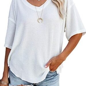 Dokotoo Women’s Causual V Neck Short Sleeve Shirts Waffle Knit Loose Tunic Tops Blouses