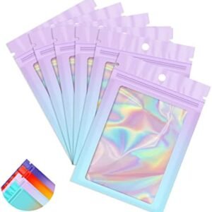 Funfery 100 Pack Gradient Holographic Bags,Mylar Resealable Bags with Zipper,Clear Window Packaging Pouch,Smell Proof Plastic Bags for Food Storage,Sample Jewelry Baggies(2.7×3.9In,Purple Blue)