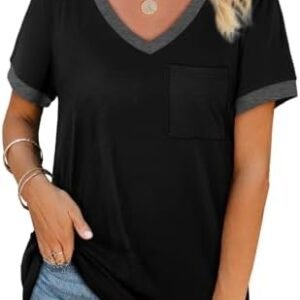 Geifa Womens T Shirts Short Sleeve V Neck Loose Casual Summer Tops with Pocket