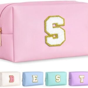Initial Cosmetic Bag for women, Preppy Small Makeup Bag, PU Leather Waterproof Toiletry Bag, Monogrammed Birthday Gifts For Women, Pink Stuff For Girls (Letter S)