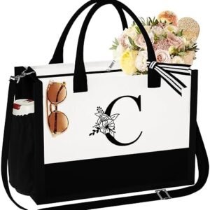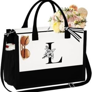 Initial Canvas Beach Tote Bag with Zipper Adjustable Strap Tote Bag Bride Gifts Mothers Day Birthday Gifts for Women