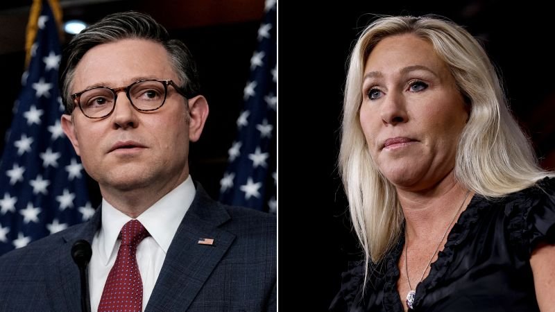 The photo shows House Speaker Mike Johnson on the left and Georgia Republican Congresswoman Marjorie Taylor Greene on the right.