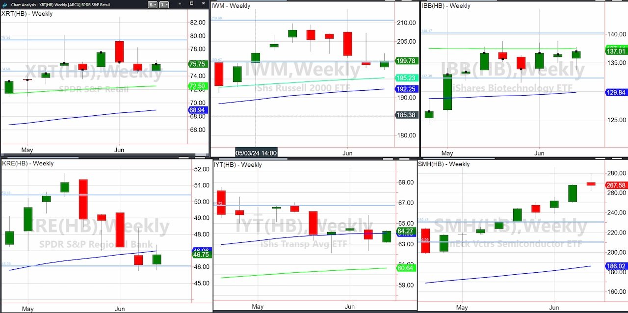 Starting with Granny Retail XRT and the weekly charts, all of the charts have two light blue horizontal lines which represent the weekly channel stretching back to around the beginning of 2024.