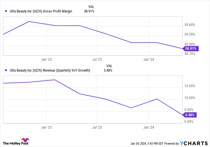 Consumers were flush with cash coming out of the pandemic, which boosted Ulta’s business. But that tailwind has faded: Sales growth has steadily slowed since peaking in 2021, and gross margins are set to peak in the second half of 2022.