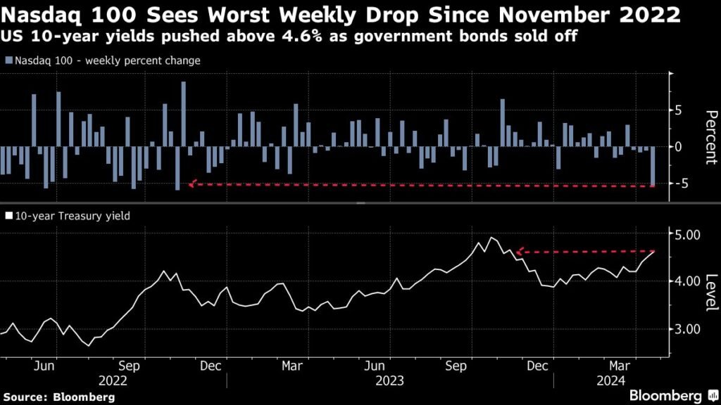 After six days of decline since last Friday, the S&P 500 recorded its worst losing streak since 2022, widening its drop in April to more than 5%. Yields on two-year notes briefly rose above 5% on Tuesday, part of a sell-off in bonds that erased gains in high-yield and investment-grade bonds this month.