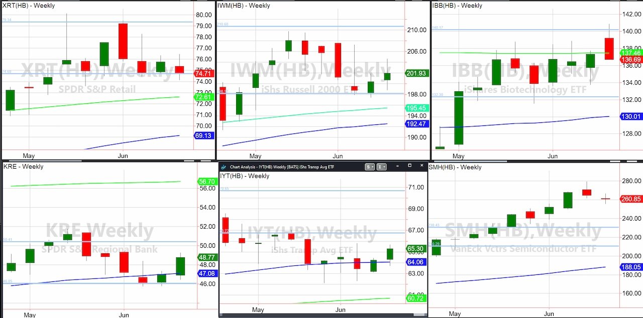 The Biotechnology Sector ETF (IBB) failed to break out of the upper limit of its weekly channel line and closed below its 200-week moving average.