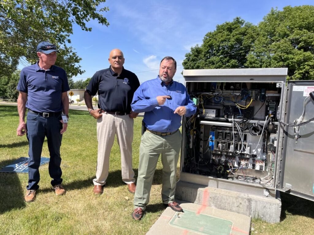 UDOT traffic engineer Blaine Leonard explains how V2X technology works at an intersection in Salt Lake City, Thursday, June 20, 2024, with UDOT Executive Director Carlos Braceras and Federal Highway Administrator Shailene Butt.