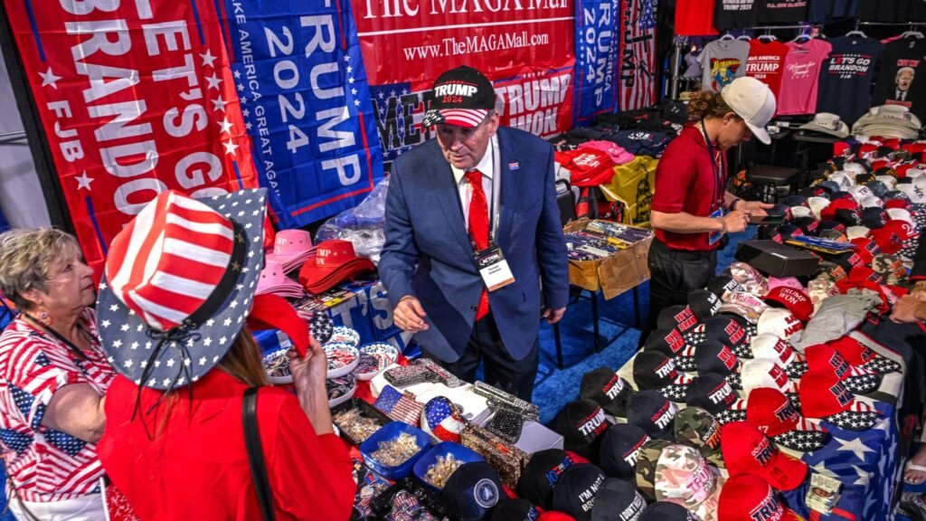 A vendor sells Donald Trump 2024 election campaign memorabilia during the “Turning Point Action USA” conference on July 15, 2023 in West Palm Beach, Florida.